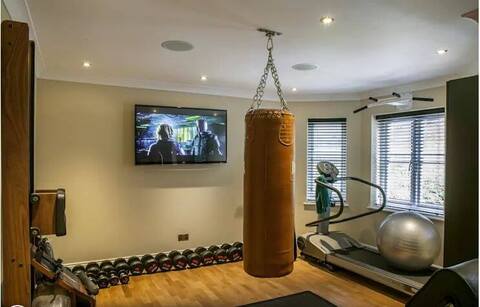 Đây là mẫu thiết kế phòng gym dành cho những gia đình có mức đầu tư ngân sách cao. Phòng gym tại nhà sang trọng giúp bạn tập luyện thoải mái và còn giúp trang hoàng cho căn nhà thêm phần đẹp đẽ, thu hút hơn. Bạn có thể chọn các loại máy tập đến từ các thương hiệu nổi tiếng và các loại đèn trang trí sang trọng và đẹp mắt.