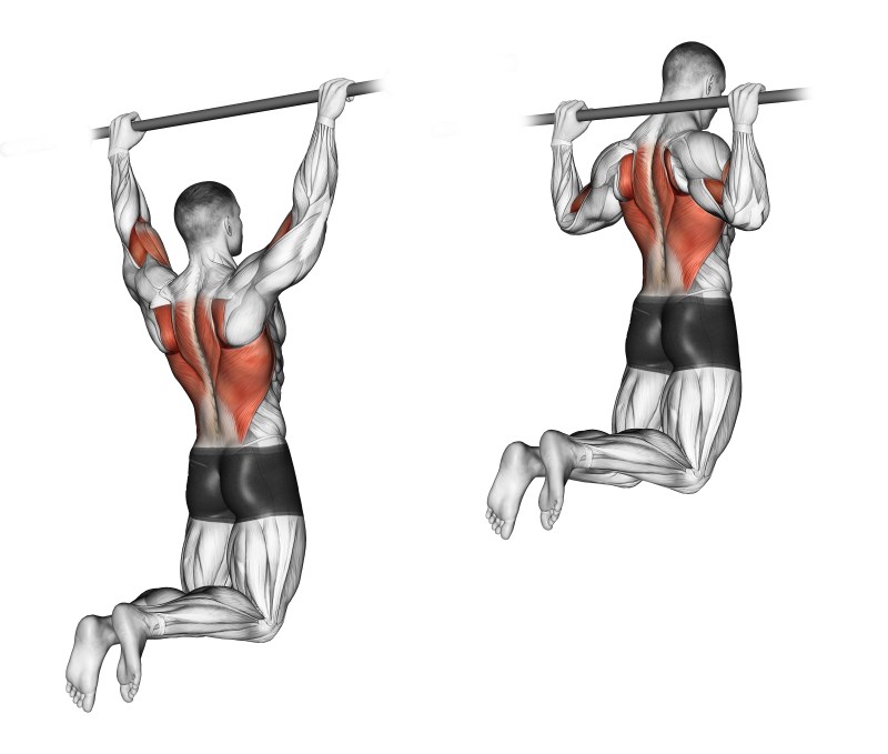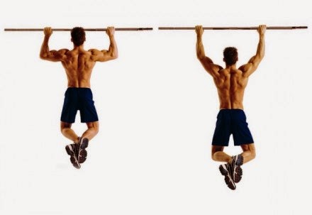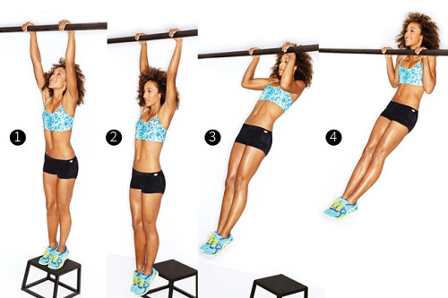Thực hiện: Treo người tự nhiên trên xà. Hai tay nắm vào xà rộng hơn độ rộng của vai. Co khuỷu tay, kéo người lên, đầu ở phía trước xà. Khi gáy gần chạm xà, buông người xuống và trở về tư thế chuẩn bị. Lặp lại động tác nhiều lần.