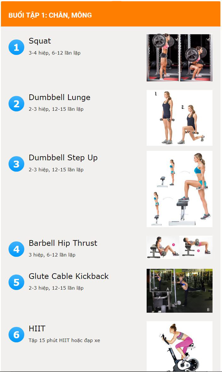 Chi tiết các bài tập ở từng buổi của lịch tập gym cho Nữ 1-5 tháng