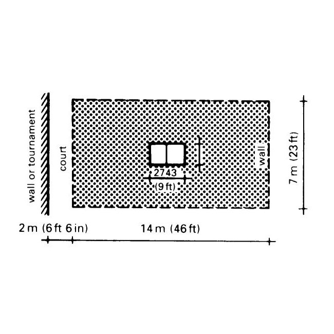 - Mỗi bàn tiếp theo phải đặt cách nhau từ 5,5m đến 6m. Những tấm phân cách giữa bàn cao tối đa 75cm bằng vật liệu mềm tránh chấn thương cho người chơi.