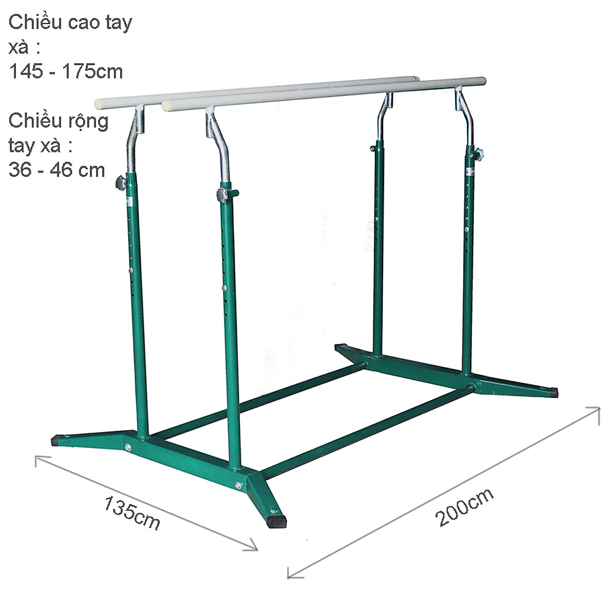 - Kích thước xà kép tiêu chuẩn, có thể điều chỉnh chiều cao của thanh xà, phù hợp cho mọi đối tượng người sử dụng.