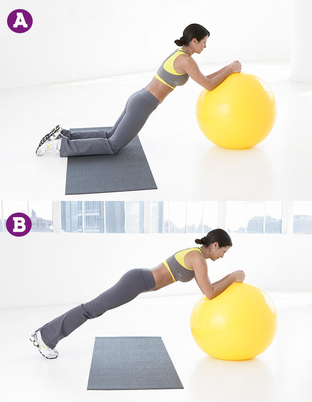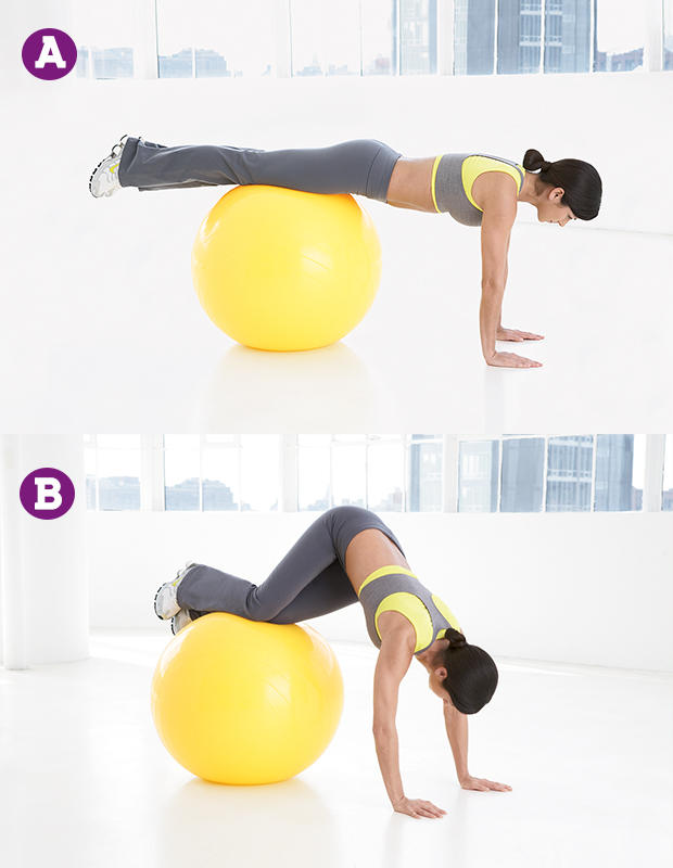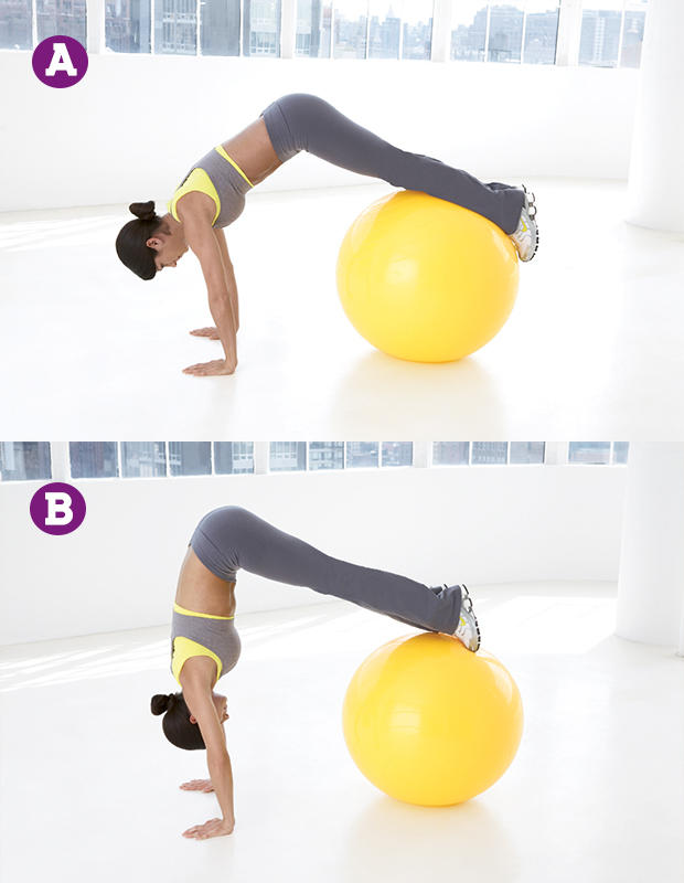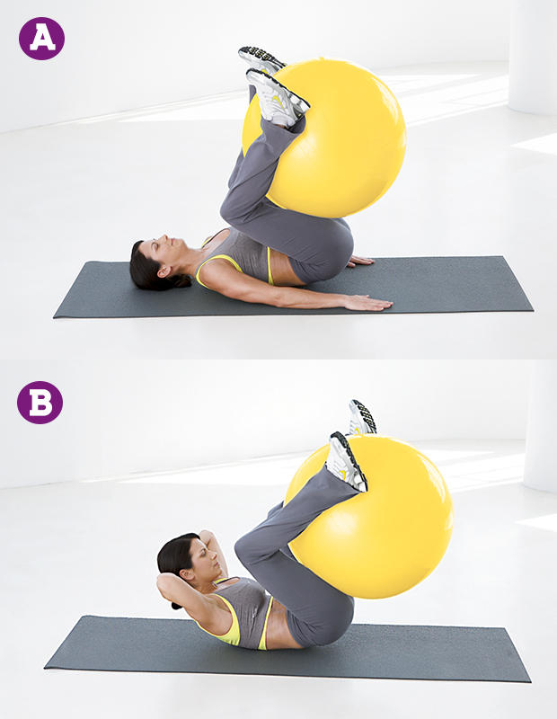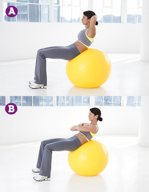 Ngồi trên quả bóng, đi bộ về phía trước, và cuộn xuống dưới cho đến khi mông vừa tắt bóng và giữa và lưng dưới là bóng, chân lại với nhau. Đặt tay đằng sau đầu. Lean trở lại, nhấn trở lại vào bóng, sau đó thở ra, chuyển động kết hợp với bụng, và lùi về phía trước cho đến khi trở lại trên nâng bóng.