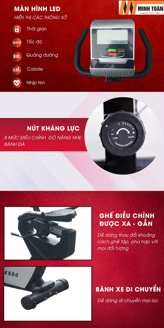 - Có chức năng điều chỉnh yên ghế và mức độ nặng nhẹ đạp xe nên phù hợp cho nhiều đối tượng sử dụng.