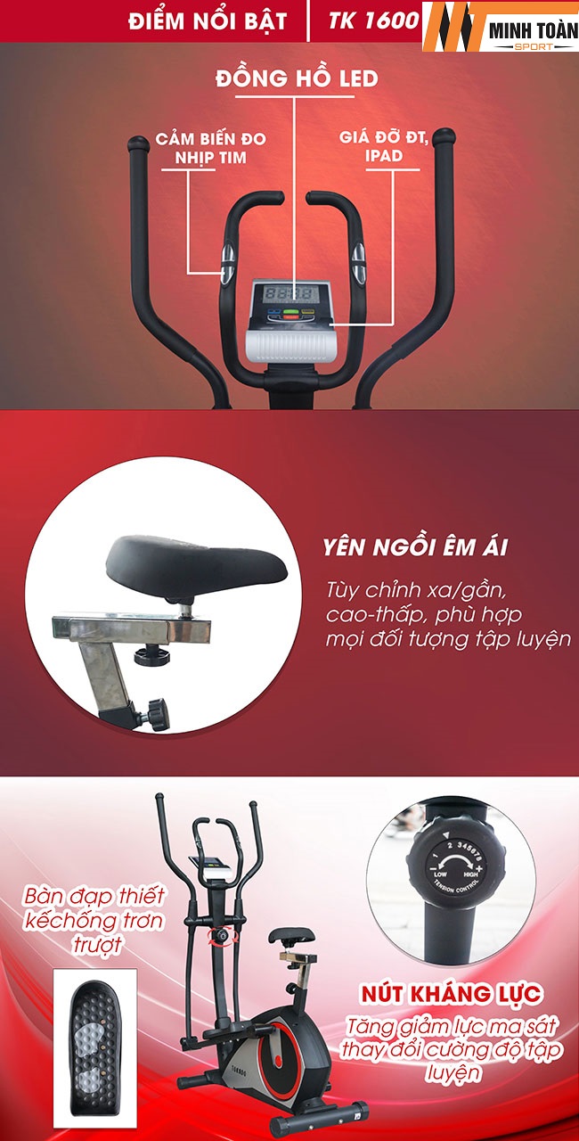 - Xe đạp tập thể dục Tokado TK 1600 được thiết kế đẹp mắt + chắc chắn, có chức năng tập vận động toàn thân hiệu quả và phù hợp sử dụng cho hộ gia đình. Đây là mẫu xe đạp thể dục "2 trong 1", vừa hỗ trợ chức năng đứng đạp xe và vừa tích hợp yên để người dùng có thể ngồi tập. Thiết kế chi tiết của xe đạp Tokado TK 1600 gồm có: