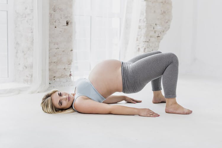 Tư thế cây cầu giúp giảm tình trạng căng bụng dưới. Song, một số trường hợp bà bầu quá đau lưng thì nên tránh tư thế này.
