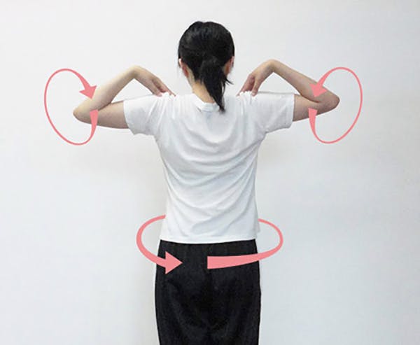 - Đặt ngón tay lên vai, sau đó xoay các khớp giống theo cách giống như bạn vẽ một hình tròn bằng khuỷu tay.